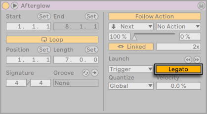 Другой вариант, который работает даже с выключенным квантованием, это привлечение режима Legato для соответствующих клипов. Когда клип в режиме Legato, то он запускается в позиции воспроизведения, как будто этот клип воспроизводился на этом треке раньше. Таким образом, вы можете переключать клипы в любой момент и с любой скоростью, не теряя синхронизации.