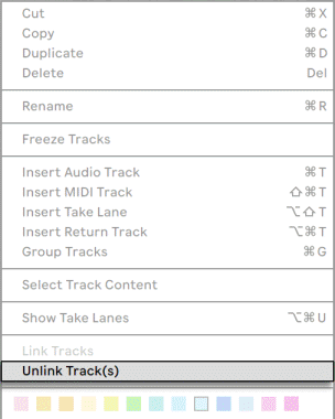 Чтобы удалить один или несколько треков из экземпляра связанных треков, выберите соответствующий заголовок трека и выберите Unlink Track(s) из контекстного меню [щелчок правой кнопкой мыши] (ПК) / [щелчок с нажатой клавишей CTRL] (Mac).
