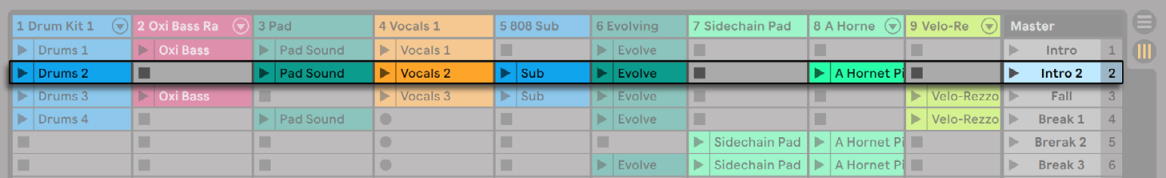 Каждый вертикальный столбец или трек может играть только один клип одновременно. Поэтому имеет смысл поставить в той же колонке множество клипов, которые должны быть воспроизведены в качестве альтернативы: части песни, вариации барабанных лупов, и т.д.