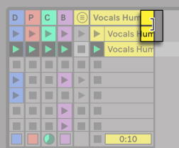 Для удобного одновременного доступа к большему количеству клипов вы можете изменить размер треков сессии, нажав и перетащив за края их названий. Треки могут быть сужены таким образом, чтобы были видны только кнопки запуска клипов и основные органы управления треком. Обратите внимание, что вы можете изменить размер всех треков окна сессии одновременно, удерживая [ALT] при изменении размера одного трека.