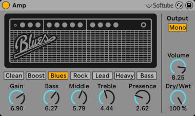 Amp это эффект, который имитирует звук и характер семи классических гитарных усилителей. Разработанный в сотрудничестве с Softube, Amp использует технологии физического моделирования ряда аутентичных и практичных тембров усилителей, с простым и последовательным набором элементов управления.