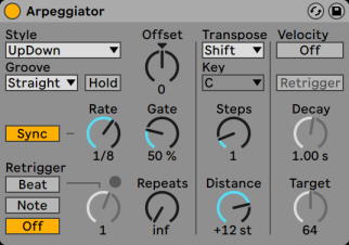 Эффекту Arpeggiator Live требуются отдельные MIDI ноты из состоявшегося аккорда (или одна нота), и воспроизводит он их как ритмический рисунок. Последовательностью и скоростью узора можно управлять с помощью устройства, которое обеспечивает полный набор как классических, так и оригинальных возможностей арпеджиатора.