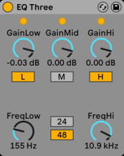 Фильтры в этом устройстве оптимизированы для хорошего звучания, мощный аналоговый каскад фильтров, в отличии от чисто цифровых фильтров. Режим 48 дБ не обеспечивает идеального качества линейной передачи, что приводит к небольшому окрасу входящего сигнала, даже если все элементы управления расположены на 0,00 дБ. Это типичное поведение для такого рода фильтров, и это является частью уникального звучания EQ Three. Если вам нужно более линейное поведение выберите режим 24 дБ или используйте EQ Eight.