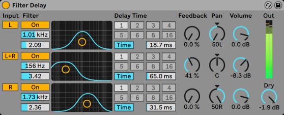 Filter Delay обеспечивает три независимые линии задержки, каждой из них предшествуют фильтры низких и высоких частот. Это позволяет применять дилэй только к определённым частотам входящего сигнала, к каким, определяется настройками фильтра. Обратная связь от каждой из трёх задержек также направляется повторно через фильтры.