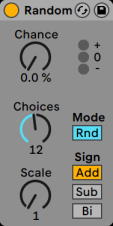 Random добавляет элемент случайности, изменяя высоту нот. Параметр Chance (возможность) определяет вероятность того, что высота входящих нот будет изменена в случайное значение. Вы можете думать о нём как о чем-то вроде параметра dry/wet случайности.