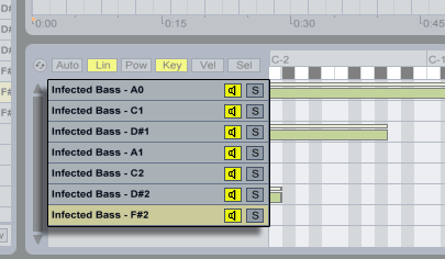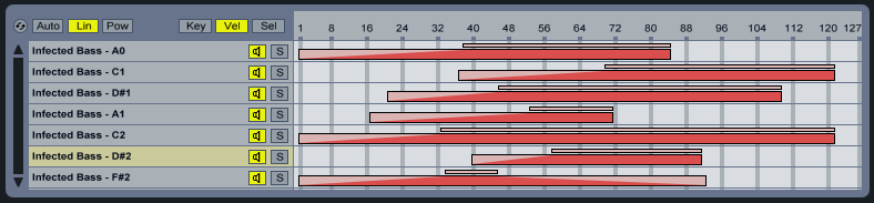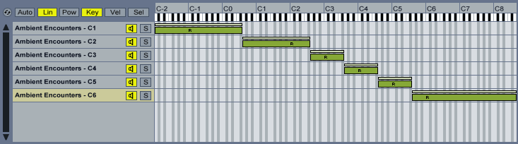 Зоны также могут иметь затухания в течении нескольких полутонов на обоих своих концах, для этого потяните верхнюю праву или левую границу зоны. Это позволяет легко создавать плавные кроссфейды между соседними сэмплами, по мере прохождения по клавиатуре. Переключатель Lin/Pow над списком слоёв указывает, каким будет затухание – линейным или экспоненциальным.
