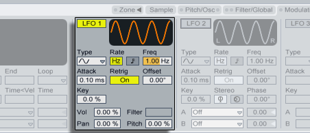 Оставшееся пространство модуляции вкладка содержит три низких частот осцилляторов (LFOs). Как следует из названия, LFOs пробоотборника работать с применением низкочастотной (ниже 30 Гц) к параметру для того, чтобы модулировать его. Заниматься любой из этих осцилляторов, нажав LFO 1, LFO 2 или 3 LFO переключателей.