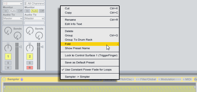 - Fold (свернуть) - сворачивает Sampler, так чтобы была видна только строка названия устройства. Открываются быстро, дважды щёлкнув по строке названия устройства.