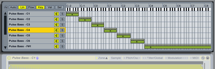 По умолчанию зона клавиш нового загруженного сэмпла охватывает весь диапазон MIDI нот. Зона может быть перемещена и изменена в размере, как клипы в окне аранжировки, измените размер с помощью перетаскивания её правого или левого краёв, а затем перетащите в нужное место.