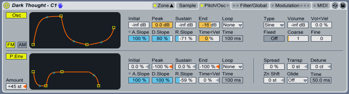Огибающая высоты тона модулирует высоту тона сэмпла с течением времени, а также модулирующий осциллятор, если он включен. Это многоступенчатая огибающая с уровнями ADSR: Initial (начало), Peak (пик), Sustain (удержание) и End (конец) кок они работают описано в разделе Проигрывание сэмпла выше. Значения параметров огибающей можно регулировать с помощью ползунков или путём перетаскивания контрольных точек на дисплее огибающей.