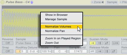 - Normalize Pan (нормализация панорамирования) - настраивает регуляторы панорамы Sampler, так чтобы каждый выбранный сэмпл имел равные уровни в стерео спектре. Заметим, что это не обязательно возвращает спанорамированный стерео сэмпл в центральное положение, а скорее Live разумно вычисляет позицию панорамирования даже для стерео разделения.