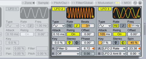 Закладка Modulation (модуляция) предлагает дополнительную зацикливаемую огибающую, плюс три LFO, все способны модулировать множество параметров, включая самих себя. Каждое LFO может работать независимо, или синхронизировано с темпом Live сета, а LFO 2 и 3 могут производить эффекты стереомодуляции.
