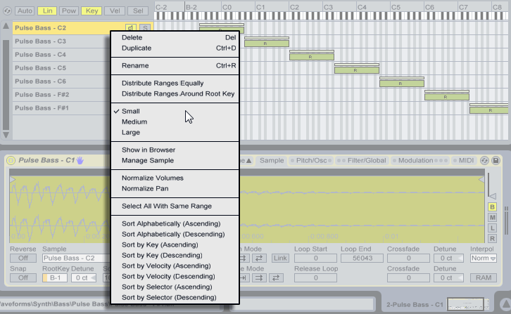 Нажатие правой кнопкой мыши (PC)/Ctrl+левая кнопка мыши (Mac) в списке слоёв сэмплов открывает контекстное меню, которое предлагает варианты сортировки и отображения слоёв, распределяя их по клавиатуре и другое различное управление сэмплами, а также варианты "наведения порядка".