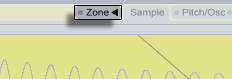 Особенность Sampler это организованность во вкладках (Zone, Sample, Pitch/Osc, Filter/Global, Modulation и MIDI), они доступны из строки заголовка Sampler. Щелчок по вкладке, кроме вкладки Zone покажет её свойства ниже. В дополнение к своим организационным по назначениями, каждая закладка имеет светодиод, они показывают, есть ли какая либо модуляционная информация в соответствующей закладке. Мы будем изучать Sampler, путём изучения каждой из этих закладок.