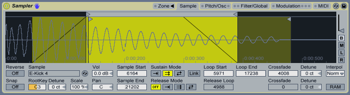 - Snap (привязка) – привязывает все начальные и конечные точки во всех сэмплах к нулевому пересечению сигнала (точки, где амплитуда равна нулю), это позволяет избежать щелчков. Так же как и в Simpler, эта привязка основана на левом канале стерео сэмплов, так что в некоторых случаях чтобы полностью устранить щелчки может потребоваться установить небольшое значение Crossfade.
