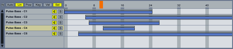 все слои, которые в состоянии проигрываться входящей нотой на протяжении этой ноты становятся выделенными в списке слоёв.- Lin/Pow (режим затухания зон) – эта кнопка переключает режим затухания всех зон между линейным и экспоненциальным изгибами.