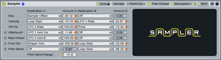Параметры закладки MIDI превращают Sampler в динамический инструмент. MIDI параметры Key (клавиша), Velocity (велосити), Release Velocity (велосити затухания), Aftertouch (послекосание), Modulation Wheel (колесо модуляции), Foot Controller (ножной контроллер) и Pitch Bend (колесо высотытона) могут быть назначены на два направления каждый, с разной степенью влияния устанавливаемой ползунками Amount A и Amount B (количество).