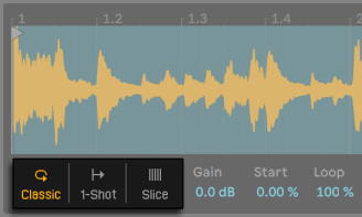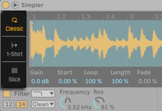 Ползунок Gain (усиление) позволяет повысить или понизить уровень сэмпла. Обратите внимание, что это каскад усиления отдельный от регулятора Volume (громкость) Simpler, который определяет конечный уровень выхода всего инструмента (после обработки через фильтр Simpler). Этот параметр доступен во всех трёх режимах воспроизведения.