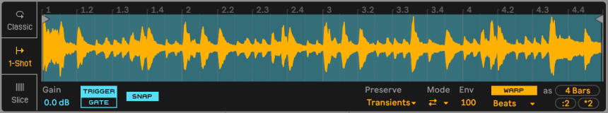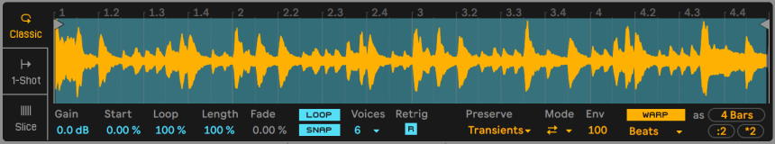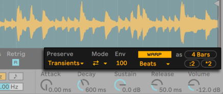 Кнопка Warp as... (варпить как) настраивает варпинг сэмпла таким образом, чтобы он воспроизводился точно в пределах указанного количества тактов или долей. Live делает лучшее предположение о том, какое это значение должно быть на основе длины сэмпла, но если он ошибается, вы можете использовать кнопки :2 или x2, чтобы удвоить или уменьшить вдвое скорость воспроизведения соответственно.