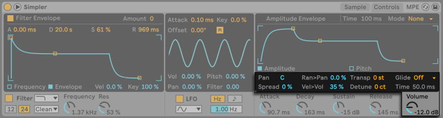 Громкость на выходе Simpler настраивается ручкой Volume, который также может зависеть от велосити ноты, регулируемой регулятором Vel>Vol. Эффекты тремоло могут быть достигнуты, если LFO модулирует параметр Volume.