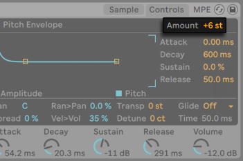 Simpler воспроизводит семпл с его исходной высотой тона, если входящая MIDI нота - C3, однако элемент управления Transpose (транспонирование) позволяет транспонировать его на +/- 48 полутонов. Высота тона также может быть модулирована LFO или огибающей высоты тона. Огибающая высоты тона звука особенно полезна при создании перкуссионных звуков. Simpler реагирует на MIDI сообщения Pitch Bend с чувствительностью +/- 5 полутонов. Вы также можете модулировать параметр Transpose с помощью огибающих клипа и внешних контроллеров. Для точной настройки высоты звука используйте регулятор Detune, который можно отрегулировать на +/- 50 центов.