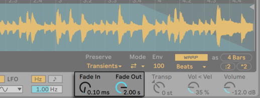 Переход от конца цикла к началу цикла можно сгладить с помощью регулятора Fade, который выполняет кроссфейд по двум точкам. Этот метод особенно полезен при работе с длинными текстурными сэмплами.