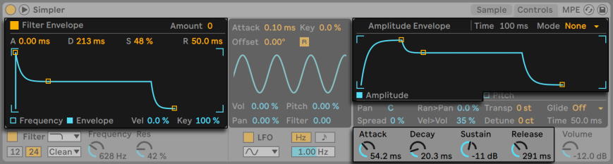 Simpler содержит три классических огибающих ADSR, которые используются в большинстве синтезаторов, для формирования динамического отклика сэмпла. Можно изменять амплитуду, частоту фильтра и модуляцию высоты тона, переключая соответствующие кнопки в разделе огибающей. Attack (атака) управляет временем в миллисекундах, которое требуется огибающей для достижения своего пикового значения после воспроизведения ноты. Decay (спад) контролирует количество времени, необходимое для того, чтобы огибающая опустилась до уровня Sustain (удержания), который удерживается, пока нота не будет отпущена. Время Release (восстановление) - это количество времени после окончания ноты, которое требуется для того, чтобы огибающая упала с уровня сустейна обратно до нуля. Эти параметры можно настраивать с помощью соответствующих элементов управления или графически, перетаскивая маркеры внутри визуализаций огибающей.