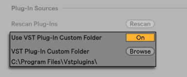 3. Убедитесь, что опция Use VST Plug-In Custom Folder установлена в значение On, так чтобы выбранная папка являлась активным источником для VST плагинов в Live. Заметьте, что вы можете не использовать VST плагины в Live выключив опцию Use VST Plug-In Custom Folder.