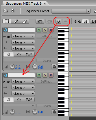 Щёлкните по созданной дорожке двойным кликом мыши для того чтобы открыть окно секвенсора. Для того, чтобы добавить или удалить инструментальные дорожки щелкните в окне секвенсора "+" или "-" (см. рис. ниже):