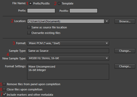 - Include Markers and Other Metadata (включение маркеров и других метаданных) - включает в звуковые файлы маркеры и информацию из панели Metadata. (См. Работа с маркерами и Просмотр и редактирование метаданных XMP).