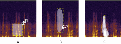 При работе в спектральном дисплее, чтобы выделять звуковые данные в конкретных областях спектра, вы можете использовать инструменты Marquee, Lasso или Paintbrush. Выбор инструмента Marquee позволяет выделить прямоугольную область. Выбор инструментов Lasso и Paintbrush позволяет сделать выделение в свободной форме. Все три инструмента предоставляют широкие возможности для редактирования и обработки, включая невероятную гибкость при реставрационных работах со звуком. Например, если вы найдёте звуковые артефакты, вы можете выделить и редактировать только затронутые частоты, получая превосходные результаты и более быструю обработку.