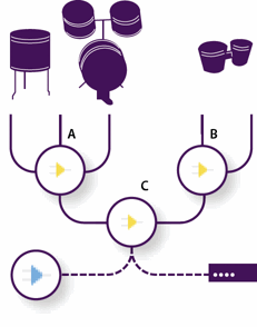 А. Шина барабанов B. Шина перкуссий C. Комбинирование выхода шины ударных либо для мастер-трека либо для аппаратного устройства