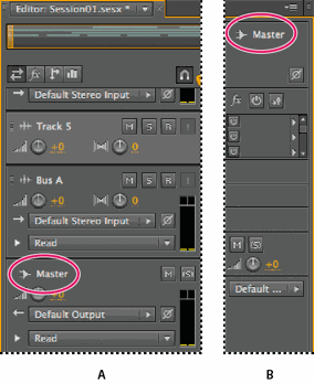 Сессия всегда содержит один мастер трек, так что вы можете легко объединить результаты нескольких треков и шин, управляя ими с помощью одного фейдера. Потому как мастер-трек существует в самом конце пути сигнала, он предлагает меньше возможностей, чем опции маршрутизации звука в аудио треках и треки шины. Мастер трек не может напрямую подключаться к звуковым входам или выходам посылов или шин, он может выводить непосредственно только на аппаратные порты.