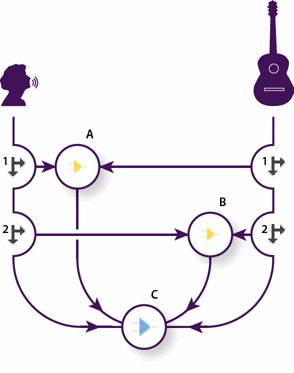 В треках шинах (bus), вы можете объединять выходы нескольких звуковых треков или посылов и управлять ими совместно. Например, чтобы настраивать громкость сразу нескольких треков ударных с помощью одного фейдера, выведите все треки на одну шину. Или, для оптимизации производительности системы, примените один эффект реверберации на трек шину, а затем создайте посылы выходов нескольких треков на эту шину. (Индивидуальное применение этой же реверберации для нескольких треков отдельно будет неэффективно использовать ресурсы центрального процессора).