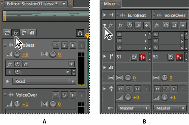 • На левой стороне Mixer, выберите треугольник Show/Hide для одного или нескольких наборов элементов управления.