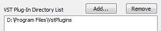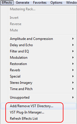Для того чтобы подключить плагин необходимо сначала указать папку где они находятся. Для этого щёлкните по вкладке Effects и выберите Add/Remove VST Directory:
