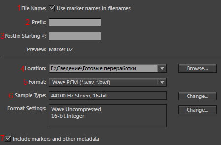 7. Include Markers and Other Metadata (включение маркеров и других метаданных) - включает в звуковой файл маркеры и информацию из панели Metadata. (См. работу с маркерами в данной статье и Просмотр и редактирование метаданных XMP).