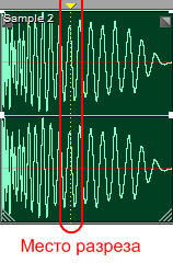 Для нарезки сэмпла на 2е части, поставьте вертикальную жёлтую полосу на то место в котором хотите разрезать сэмпл, после этого щёлкните по этому сэмплу правой кнопкой мыши и выберите Split (рисунок выше):