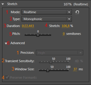 • Realtime (реальное время) - позволяет прослушивать результат растяжения при перетаскивании клипов в реальном времени. Этот режим является хорошим выбором для процесса редактирования.