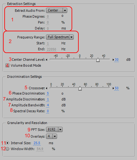 7. Amplitude Discrimination and Amplitude Bandwidth (амплитудная дискриминация и амплитудная полоса пропускания) - суммирует левый и правый каналы и создает 180° противофазный третий канал, который Audition использует, для удаления аналогичных частот. Если уровень на каждой частоте аналогичен, то и звук в каналах – тоже. Малые значения Amplitude Discrimination и Amplitude Bandwidth удаляют больше материала из микса, но могут также удалять и вокал. Более высокие значения заставляют извлечение больше зависеть от фазы материала и меньше от амплитуды канала. Хорошо работают значения Amplitude Discrimination между 0.5 и 10 и Amplitude Bandwidth между 1 и 20.