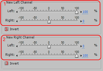 - New Left Channel (новый левый канал) - определяет процент левого и правого каналов, при создании нового левого канала. Например, значения L50 и R50 создадут новый левый канал, который будет содержать в себе равное соотношение текущих L и R каналов. Тогда как значения L0 и R100, также создадут новый левый канал, содержащий в себе только звуки от текущего правого канала.