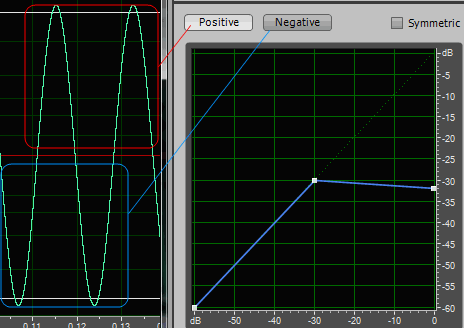 - Positive/Negativ (позитивный/отрицательный) - два разных графика дают возможность создания различных искажений для положительных и отрицательных частей сигнала. График positive для положительных (верхних), negativ для отрицательных (нижних).