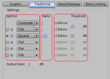Нажмите Traditional чтобы указать коэффициенты и пороги в более традиционном режиме. Вы можете выбрать Compress, Flat, или Expand в шести разделах, каждый со своими собственными значениями Ratio и Trshold. Например, чтобы сделать компрессию 3:1 выше ‑20 дБ, выберите Compress (Сжать), а затем укажите Ratio (соотношение) 3:1 и Threshold (порог) ‑20 дБ. Если же вы хотите расширение 2:1 ниже –20 дБ, выберите Expand (Расширить) и затем укажите Ratio (соотношение) 2:1.