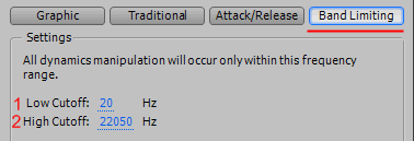 - High Cutoff - cамая высокая частота, на которую будет влиять динамическая обработка. Чтобы использовать весь диапазон частот в исходном материале, введите половину текущей частоты дискретизации.