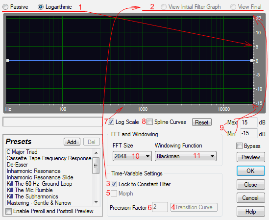 - Precision Factor определяет количество сэмплов, сохраняющихся из выборки Фурье. Значение 2 означает, что сохранятся 1/2 сэмплов, 10 - что сохранятся 1/10 сэмплов. Если параметры эквалайзера меняются очень быстро, то используйте большую точность.