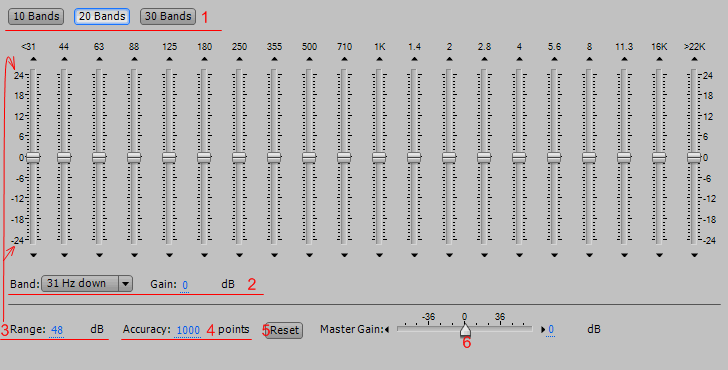 4. Accuracy - устанавливает уровень точности полос эквалайзера. Более высокий уровень точности (больше КИХ-фильтров) даёт более точное АЧХ, особенно полезно в нижнем диапазоне, но требует больше времени на обработку. Если необходимо выровнять очень низкие частоты, выберите точность от 500 до 5000 точек;