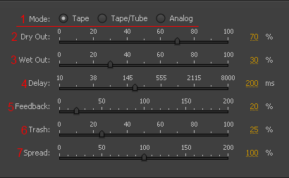 1. Mode (метод) - определяет тип аппаратной эмуляции, определяющий характеристики эквализации и искажений. Tape (лента) и Tube (лампа) изображают звуковые характеристики винтажных дилэев, в то время как Analog (аналог) изображает поздние электронные дилэи.