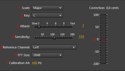 - Calibration (калибровка) - определяет стандартную тональность для калибровки звука. В западной музыке, стандарт калибровки тональности A4 = 440 Гц. Но возможно, что источник звука был записан с использованием других стандартов, так что вы можете указать значение от 410 Гц до 470 Гц.