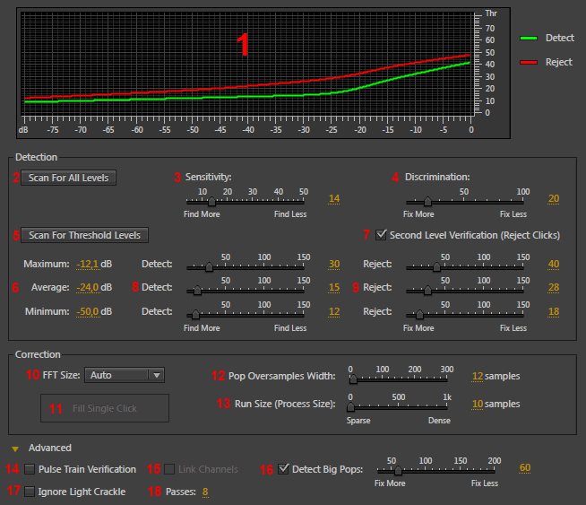 Настройки обнаружения и коррекции используются для поиска щелчков и треска. Диапазоны обнаружения и отклонения отображаются в графическом виде.