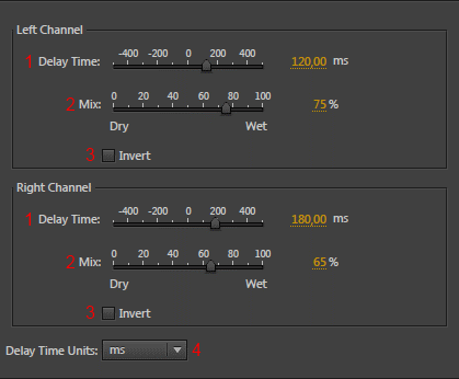 - Delay Time (время задержки) - настраивает задержки для левого и правого каналов от -500 до 500 миллисекунд. Ввод отрицательного значения означает, что вы можете перемещать канал вперёд во времени, а не задерживать его.